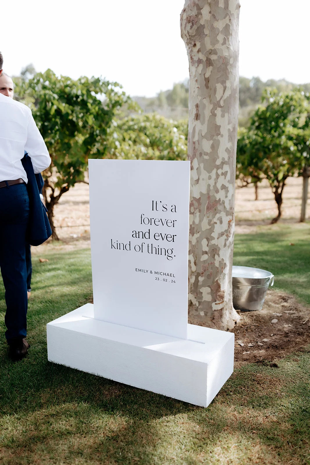 As the celebration unfolded under the Wilyabrup sun, the stationery elements seamlessly complemented the natural beauty of the vineyard. A chic welcome sign greeted friends and family, and elegant table menus continued the theme of minimalist charm. The curated design, with its ivory, black, and soft gold palette, felt both intentional and effortlessly harmonious with the rustic setting.