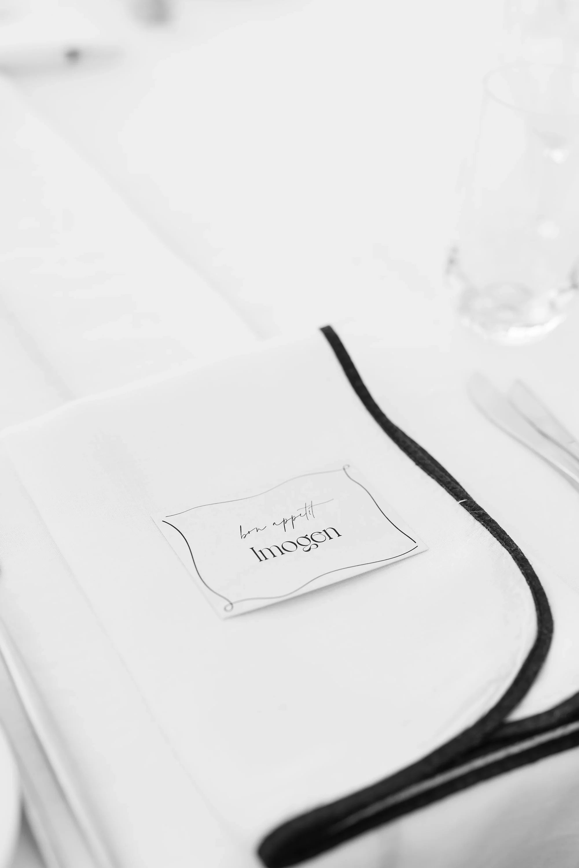 On-the-Day Items: Rounded menus, welcome sign, bar sign, and custom signature cocktail sign — each piece designed to reflect the couple’s timeless monochrome theme.