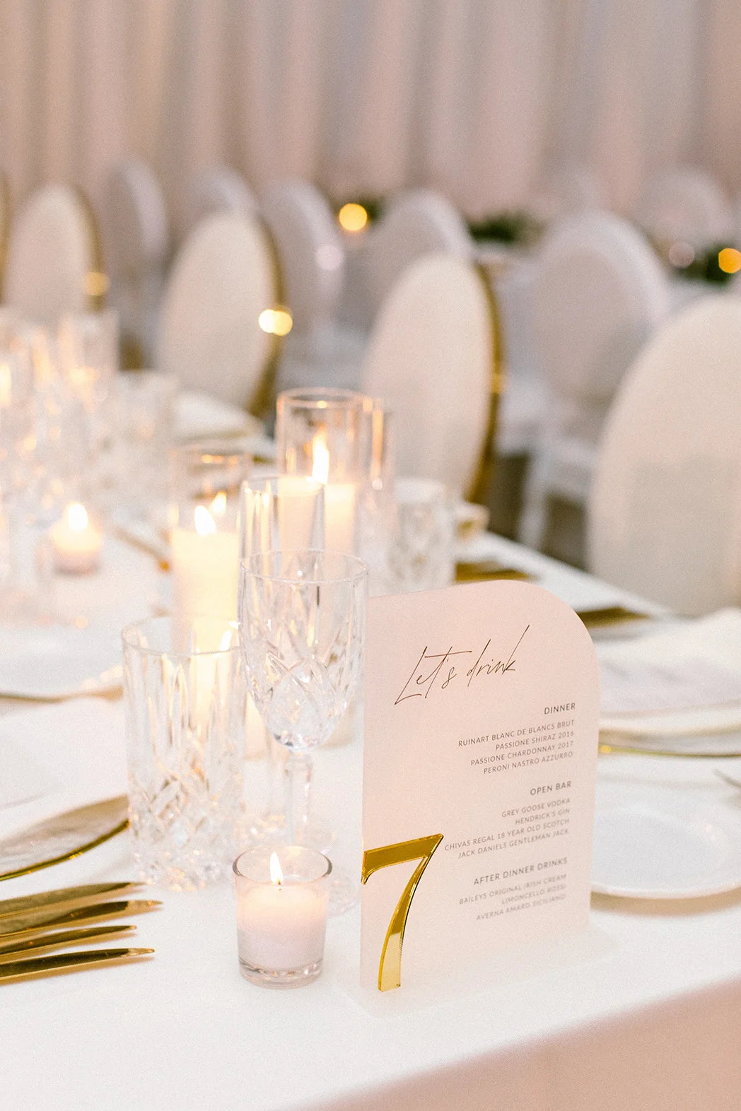 On-the-Day Items: Coordinated menus, personalised acrylic coasters, welcome signage, and a frosted seating chart — blending modern materials with traditional styling