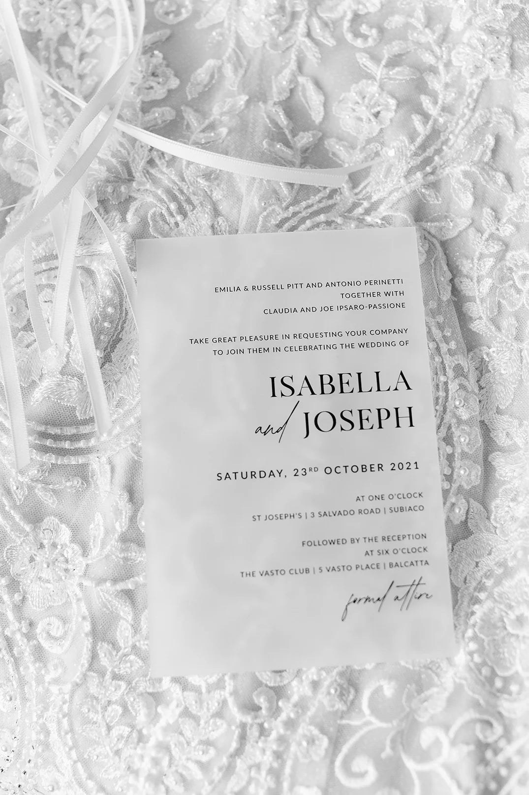 In a beautiful blend of old and new, Isabella and Joseph’s wedding was a testament to their unique style. The cool, contemporary edge of the frosted stationery perfectly complemented the warmth and joy of their celebration, creating a day that was as memorable and unique as their love story.
