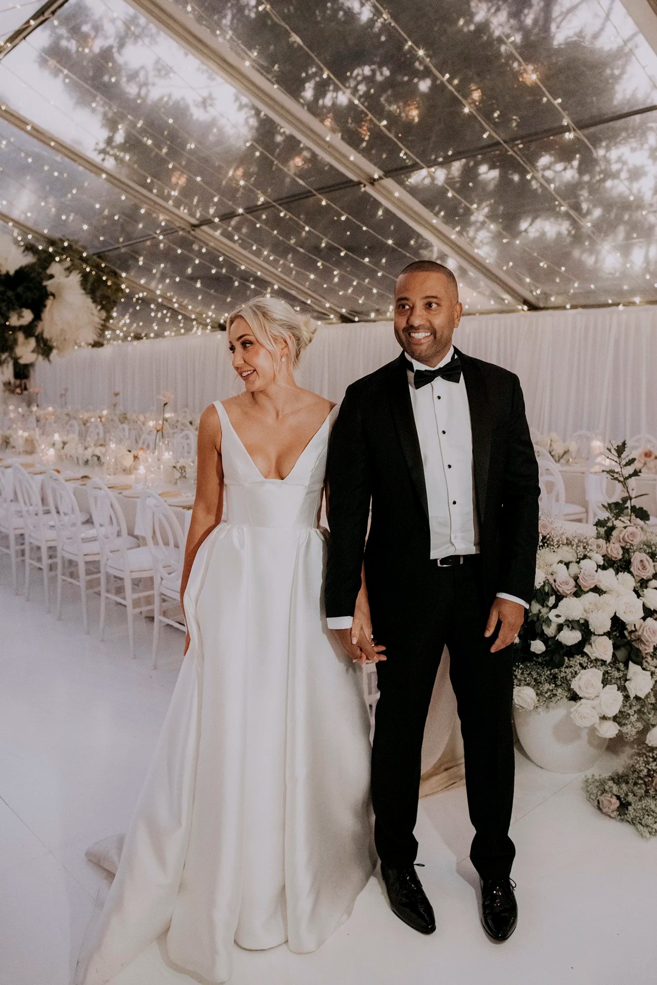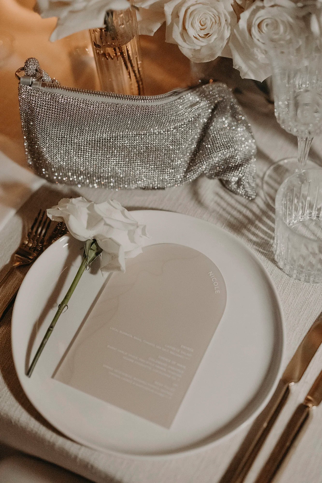 This elegant aesthetic flowed seamlessly into the celebration itself. As guests gathered, they were greeted by sleek signage in frosted acrylic. The reception tables were a vision of tonal cohesion, with matching frosted acrylic menus personalised with each guest's name, creating a polished and personal table experience. The use of modern materials blended perfectly with the natural beauty of the reserve, creating an atmosphere that was both contemporary and timeless.