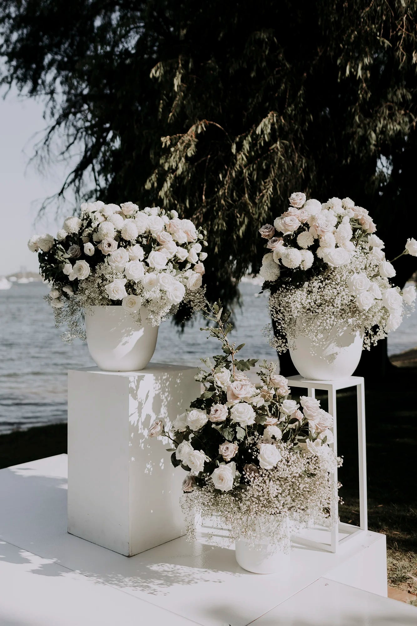 With the iconic riverside backdrop of Matilda Bay Reserve, Nicole and Arul celebrated their union with a day defined by sculptural texture and clean simplicity. Their February wedding was a masterclass in modern romance, using a serene palette of crisp white, translucent acrylic, and natural tones that perfectly complemented the idyllic Perth scenery.