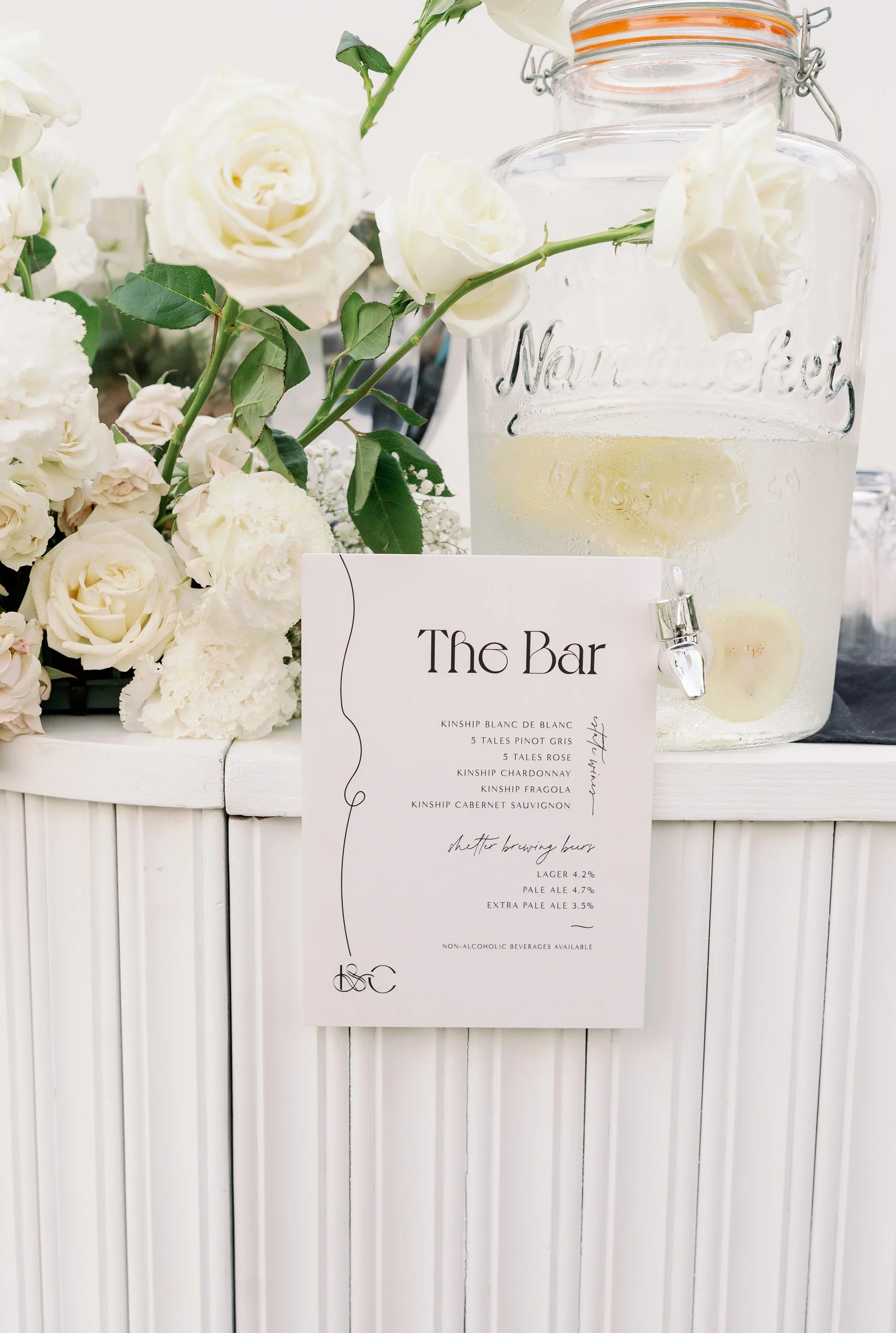 We offer a curated palette of ink colours and a library of refined serif and script fonts. Your bar signage will be designed to integrate seamlessly with your invitation suite and wider reception stationery for a cohesive "brand" experience from start to finish.
