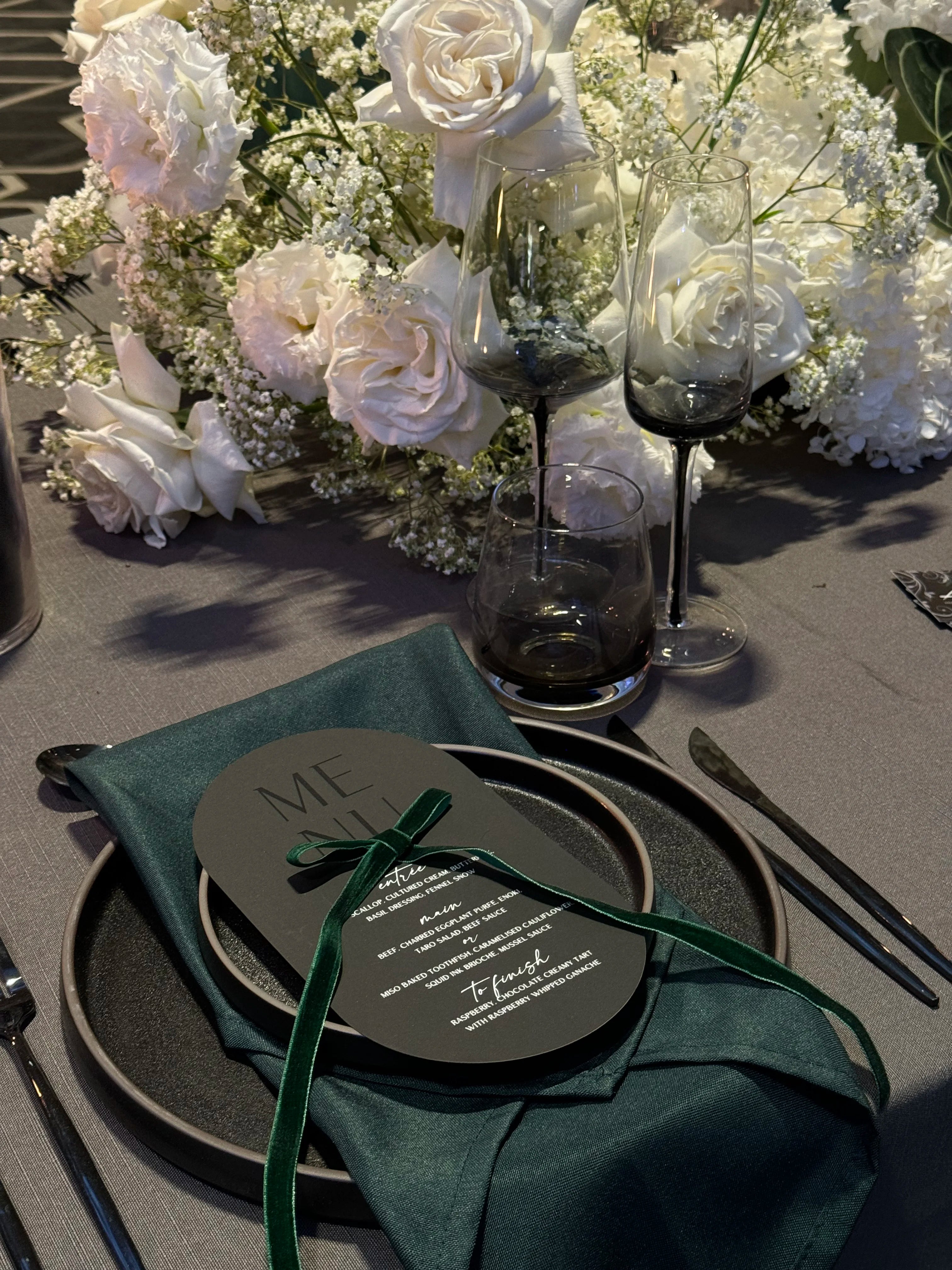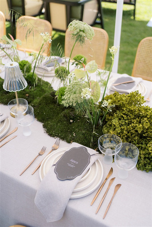 We design and print luxury, tactile menus - from striking die-cut cardstock to flowing fabric - crafted to be the visual anchor of your tablescape. If you are looking for a flawless, editorial finish that transcends the traditional, you have arrived.