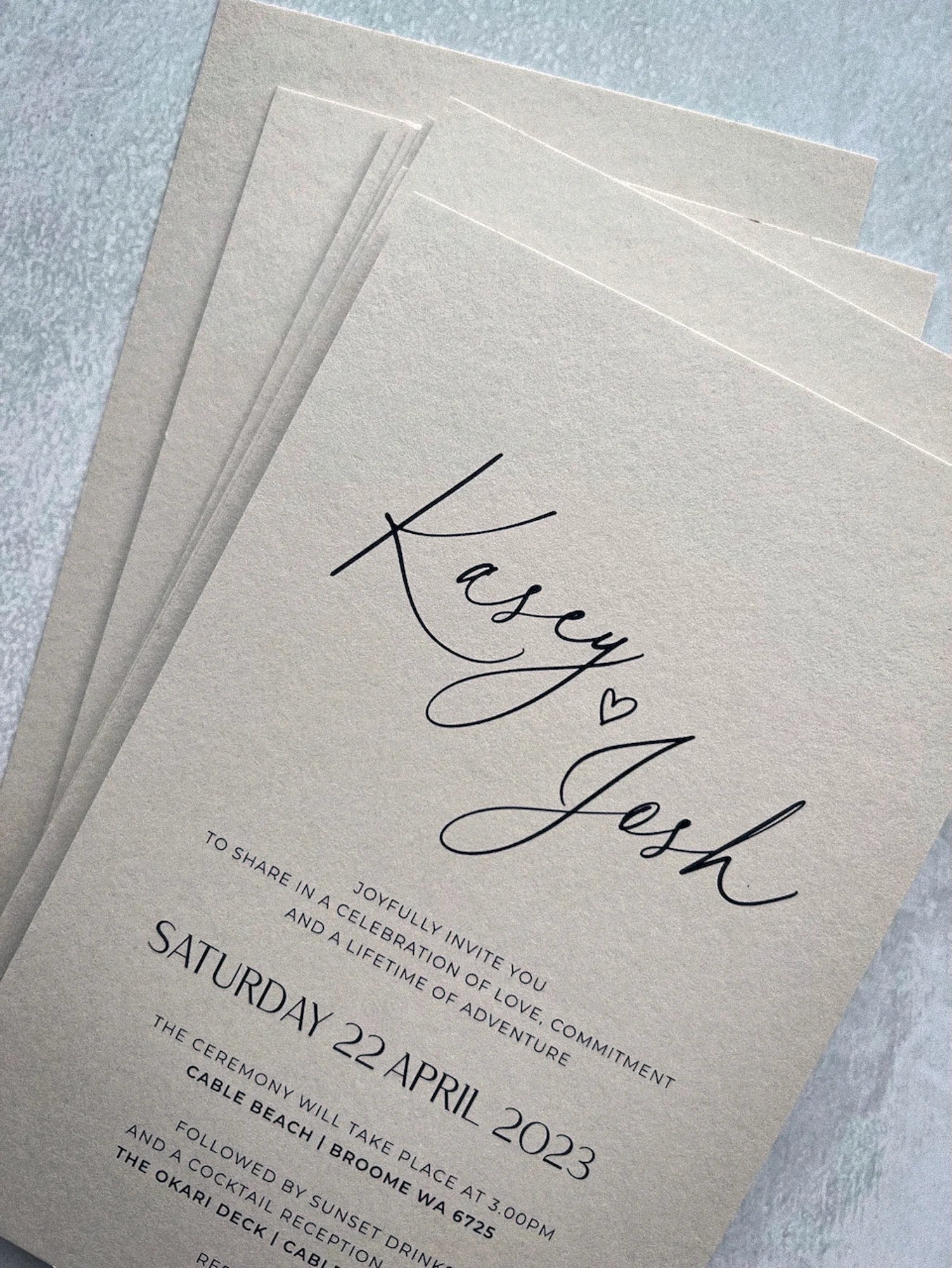 To maintain the integrity of the design, fonts are fixed as per the sample. If you require custom font pairings, we recommend viewing our Curated Collection.