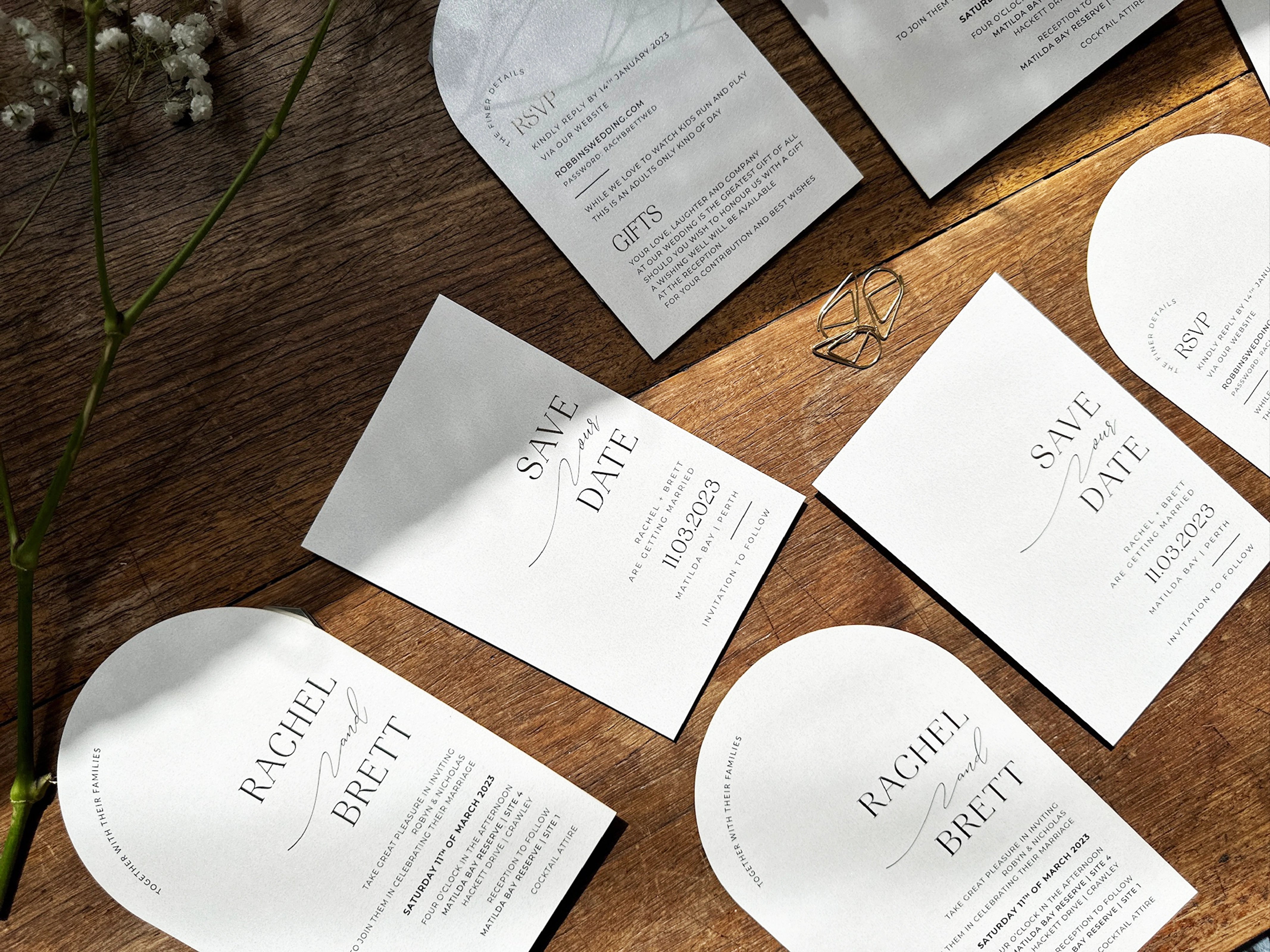 We ensure a seamless look across your entire wedding. From your Engagement Party and Save the Date through to your final Thank You cards, every piece is designed to align perfectly with your wedding invitation suite.